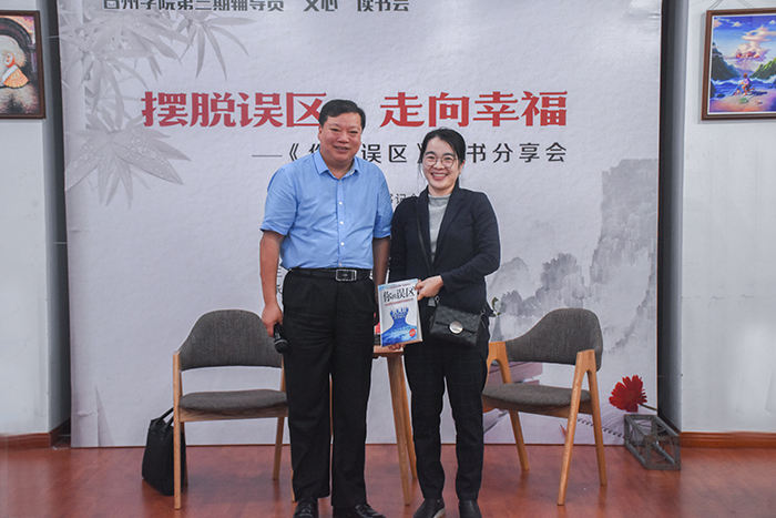 当天晚上,窗外下着雨,读书会现场笑声不断。金书记将《你的误区》赠送给最佳提问者,并与全体人员合影留念。