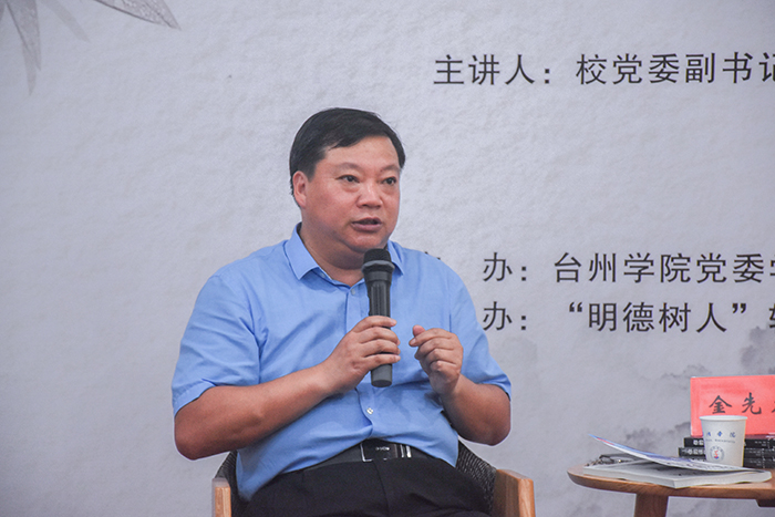 金先龙副书记从自己的老员工活切入,谈及当年的迷茫与困惑,无意中翻看了《你的误区》这本书,从而启发自己走出误区,走向豁达与幸福。他表示,这本书的精髓在于如何正确评价自己,而不能过于在意别人的评价。他还非常动情地聊到自己当班主任的经历,曾参与一起处理员工作弊的前因后果,强调思政工作一定要用爱心和真心对待每一位同学。接着,金书记就辅导员如何保持好奇心、引领员工成长以及如何提高员工的文化认同,分享了自己的见解。他建议在场的老师深入员工,拉近与员工的距离,鼓励大家学习中华优秀传统文化,提高文化自信。