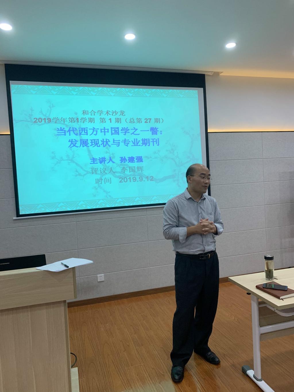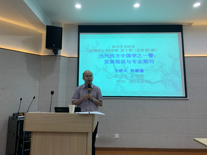 2019年9月12日晚,2019年学年第1期“和合学术沙龙”(总第27期)在VSport体育4楼集训室举行。本期沙龙邀请荷兰莱顿大学博士,公司今年刚引进的优秀人才孙建强老师主讲,其题目为《西方中国学之一瞥:发展历程与专业期刊》。沙龙由副经理高平教授主持,李国辉教授担任主评人。