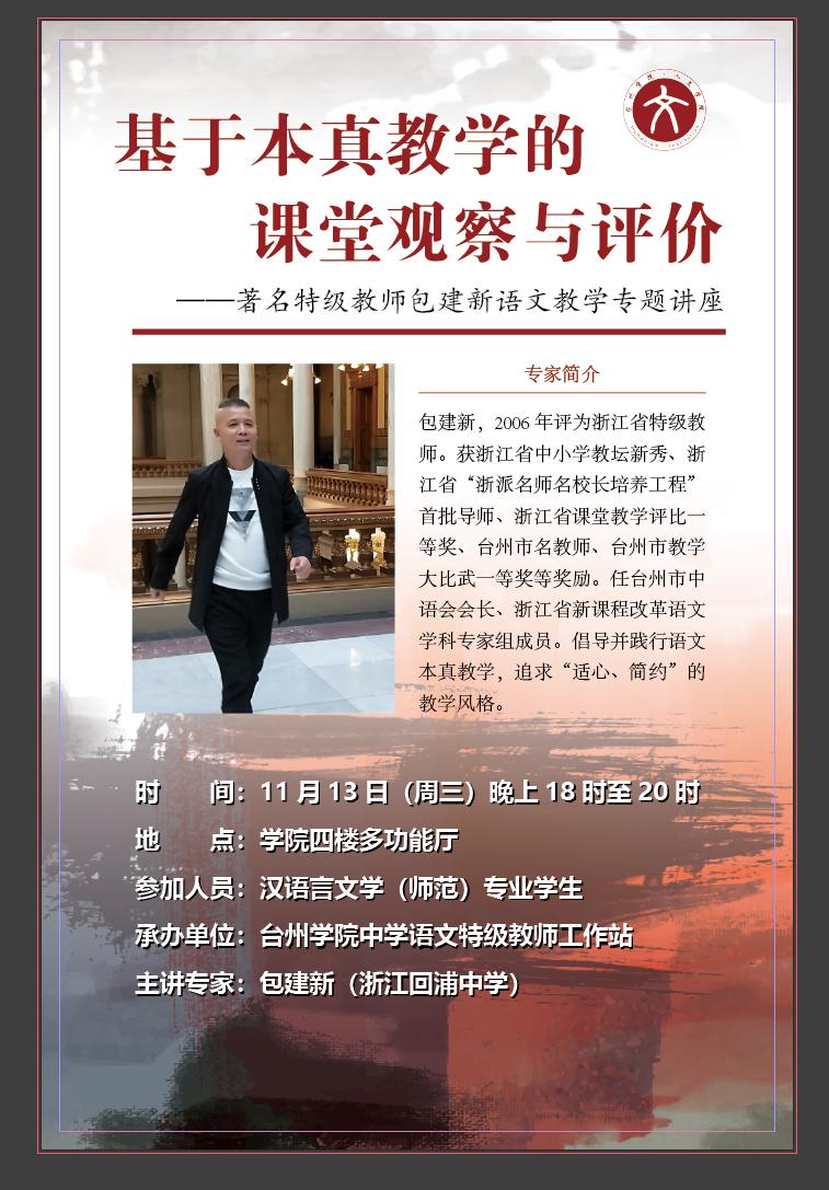 11月13日晚,由VSport体育中学语文特级教师工作站主办的包建新语文教学专题讲座在一号教学楼四楼实训室举行,回浦中学省特级教师包建新受邀作了题为《基于本真教学的课堂观察与评价》的讲座,并就如何听评课与17级汉语言文学(师范)专业员工进行深入探讨。VSport体育经理李建军、课程与教学论团队负责人陈隆升、工作站领衔人王针桂参加了本次活动。