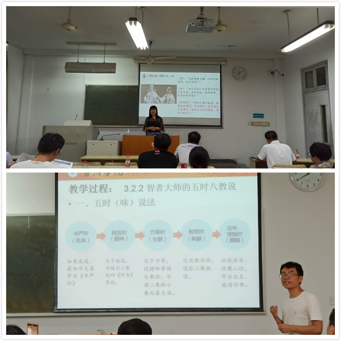 我院新进的4名青年教师杜瑶瑶、郝金广、徐旭敏、严胜英分别进行了15到20分钟的讲课或说课。杜瑶瑶博士对《桃花扇》的第七出《却奁》和第四十出《入道》进行了讲解,总结出“国家至上”的主题。郝金广博士以《智者大师的“五时八教”说》为题进行说课,对“五时八教“的具体内容、发展阶段、佛学意义进行了解释。徐旭敏博士以现代文学名著《白鹿原》为例,分析中国迥异于西方的人伦观根源在于宗法制度和乡贤自治。严胜英博士主讲屈原《九歌》《山鬼》两篇的思想感情、艺术特质,突出其巫祭文化的本质。