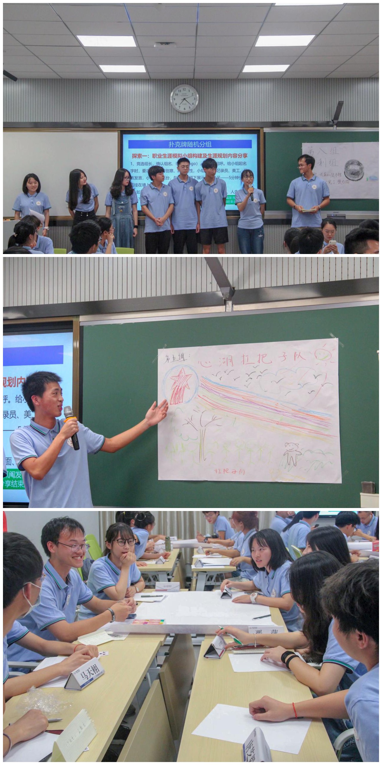 叶才华老师从两个切入点引导同学们进行探索。在第一个探索点——职业生涯模拟小组构建及生涯规划内容分享中,通过抽取扑克牌随机分组,每个小组在规定时间内设计自己的组名、组徽、组歌、组呼,并且回答从哪些方面进行职业生涯规划,探索人生的意义及求职方向,短短地二十分钟内,各小组就建立起了对职业生涯规划的初步观点。叶老师更是从身心健康、自我管理两个方面和同学们展开了讨论,并引导员工生涯规划应从“全角色、全过程”视角去思考,拓展了同学们的思维广度。