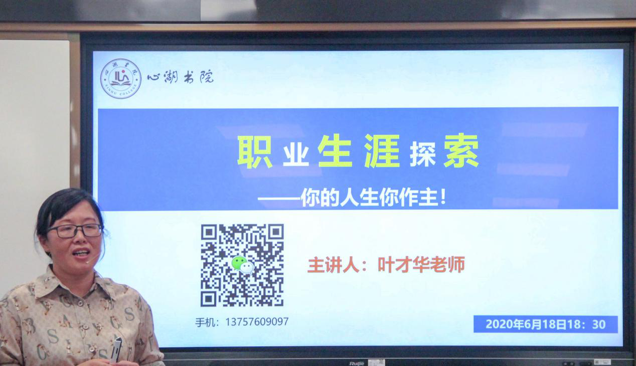为了帮助书院学子了解职业规划的重要性,更好地进行自我认知,对未来的职业生涯有一个明确系统的规划,6月18日晚,心湖书院在椒江校区4号教学楼智慧教室举办第三期心湖讲坛。活动邀请商公司叶才华老师作题为“职业生生涯探索----你的未来你做主”主题讲座。心湖书院副经理刘贵花主持讲座,辅导员姚卓琳及书院全体员工参加聆听。