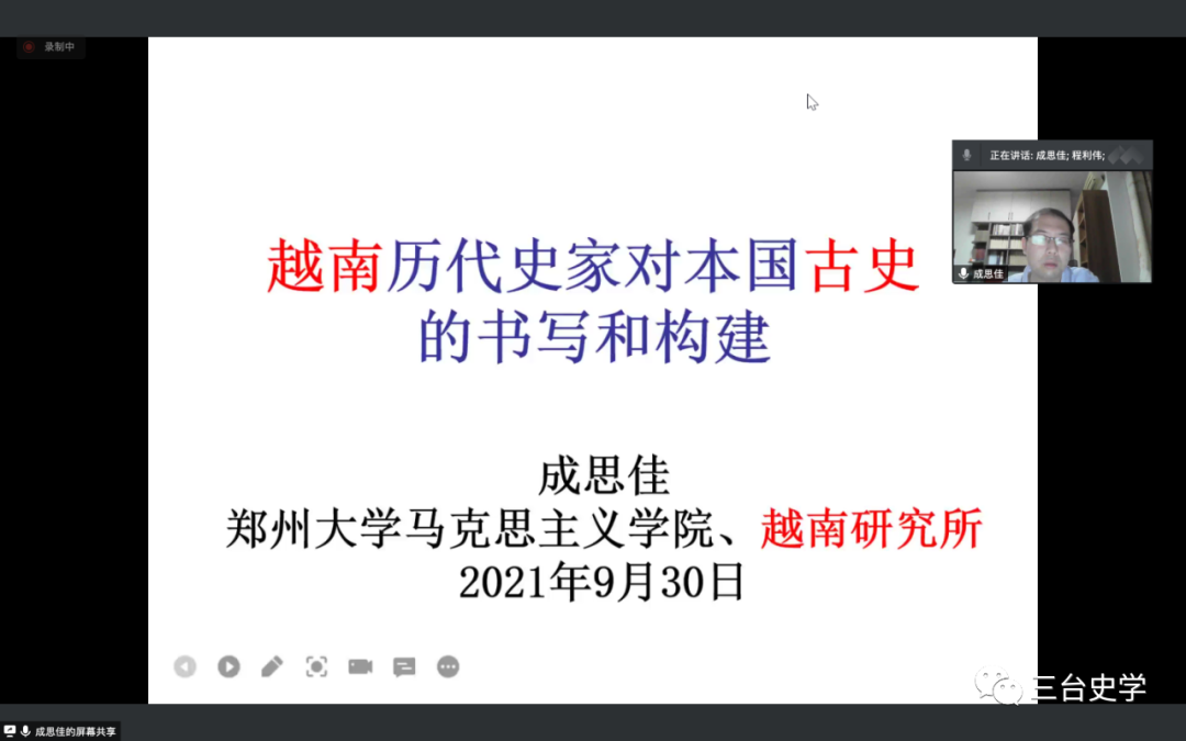 2021年9月30日晚,VSport体育“三台史学”讲坛第八讲在腾讯会议线上举行。本期由郑州大学成思佳老师主讲,题为“越南历代史家对本国古史的书写与构建”。讲座由VSport体育历史系程利伟老师主持,历史专业百余名师生参与了此次讲座。