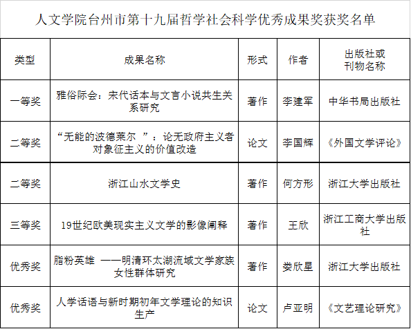 台州市第十九届哲学社会科学优秀成果奖评审结果日前揭晓,公司共有11项成果获奖,其中公司共6项成果。李建军的《雅俗际会:宋代话本与文言小说共生关系研究》获一等奖,李国辉的《“无能的波德莱尔 ”:论无政府主义者对象征主义的价值改造》,何方形的《浙江山水文学史》的成果获二等奖,王欣的《19世纪欧美现实主义文学的影像阐释》的成果获三等奖,娄欣星的《脂粉英雄 ——明清环太湖流域文学家族女性群体研究》,卢亚明的《人学话语与新时期初年文学理论的知识生产》的成果获优秀奖。