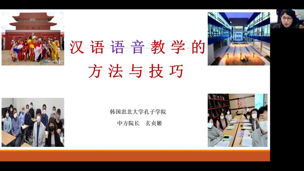讲座伊始,玄贞姬老师向大家简要展示了孔子公司的派遣及设置情况、韩国忠北大学的孔子公司设立及运营情况。随后,老师通过一系列例题讲述了对外汉语教学过程中的语音教学技巧及应用方法,参会师生受益匪浅。