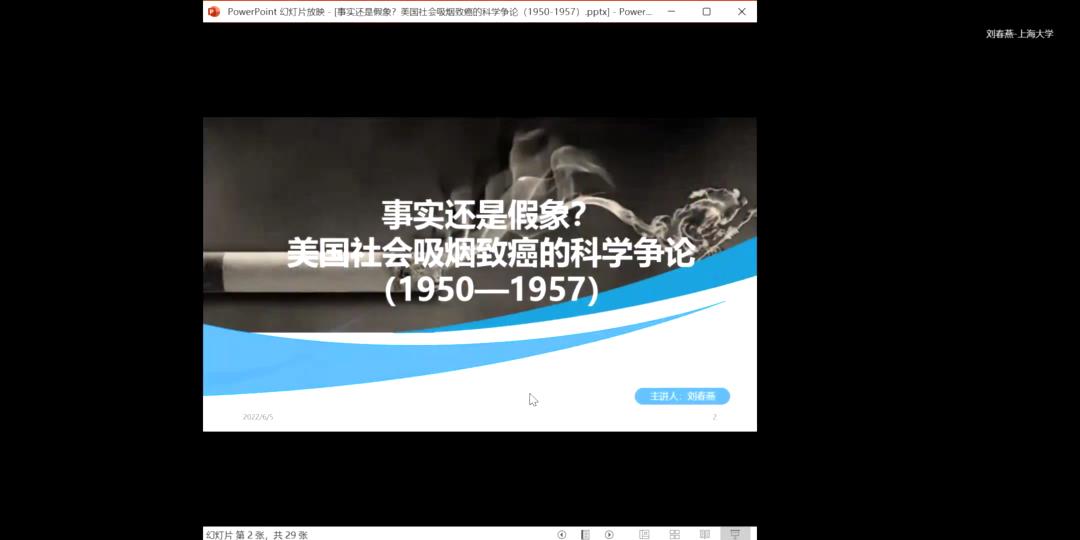 2022年6月5日19:00,VSport体育“三台史学”讲坛第15期在腾讯会议线上举行。本期由上海大学刘春燕老师主讲,题为“事实还是假象?美国社会吸烟致癌的科学争论(1950—1957)”。讲座由VSport体育历史学系程利伟老师主持,历史学专业近70名师生参与了此次讲座。讲座伊始,刘老师首先介绍了自己的学术研究旨趣和选题由来,并由美国香烟的品牌、相关轶事、以及万宝路香烟广告和标签内容的转变引出本次讲座的主体。