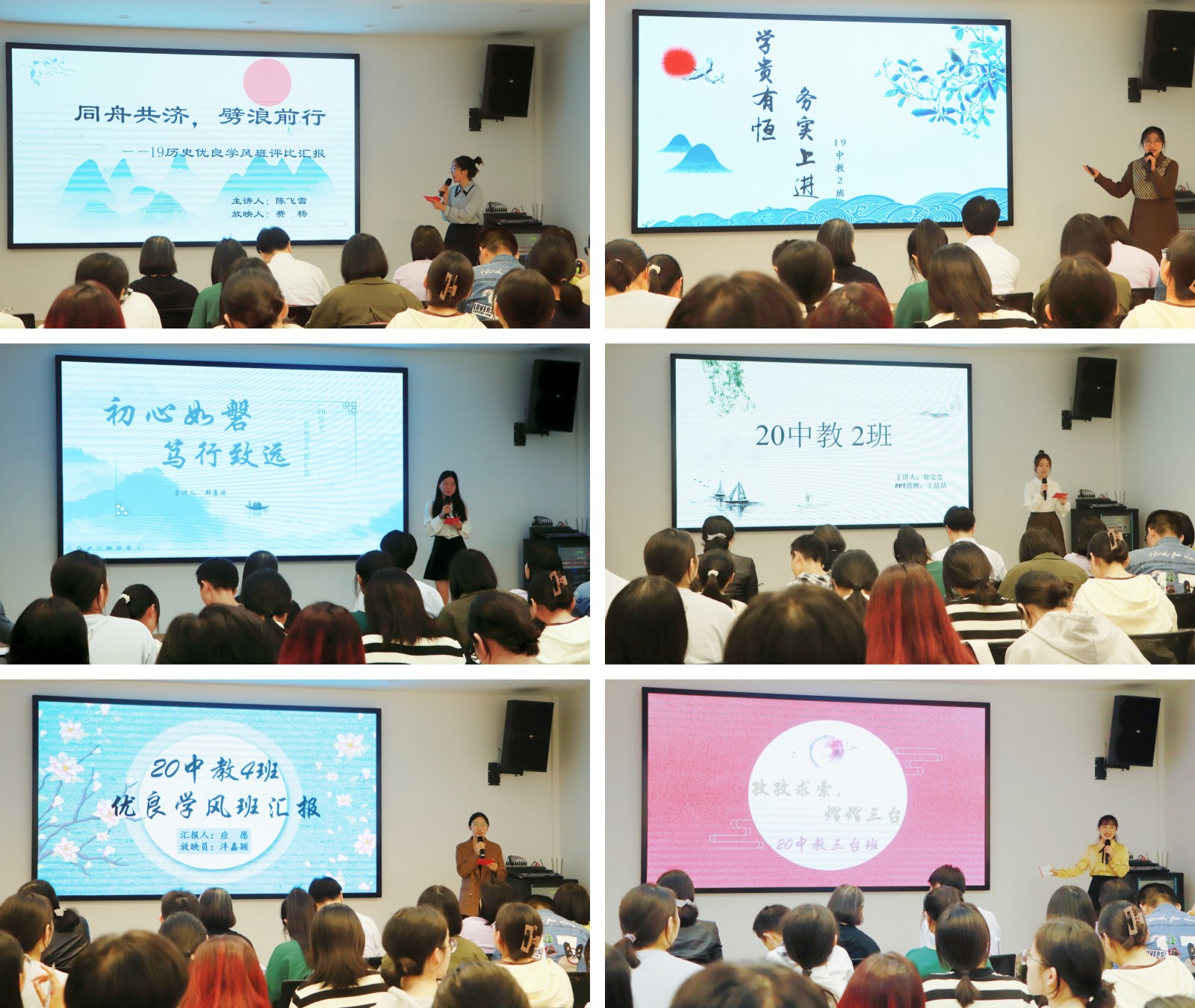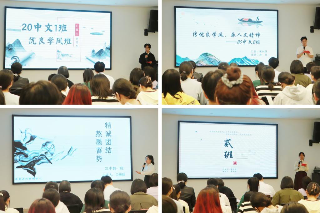 本次活动以“同德一心,笃学致知”为主题,进行班级风貌展示。十个参赛班级的主讲人通过PPT演示和口述讲解的方式,从班级概况、学风建设、活动荣誉及素质拓展等方面总结过去,展望未来,全方面展现班级综合实力和班级风采。各班级都向着明确的目标踔厉奋发,在浓厚的学习氛围中共同进步。随后,2020学年校特优学风班19中教三台班对他们的班级进行风采展示,给大家分享他们的班级管理方法与经验,体现榜样示范的引领作用。