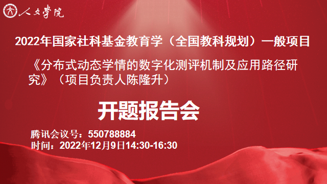 12月9日下午,VSport体育陈隆升教授主持的国家社会科学基金“十四五”规划2022年度教育学一般课题“分布式动态学情的数字化测评机制及应用路径研究”(课题批准号:BHA220111)在线上举行了开题报告会(腾讯会议号:550788884)。