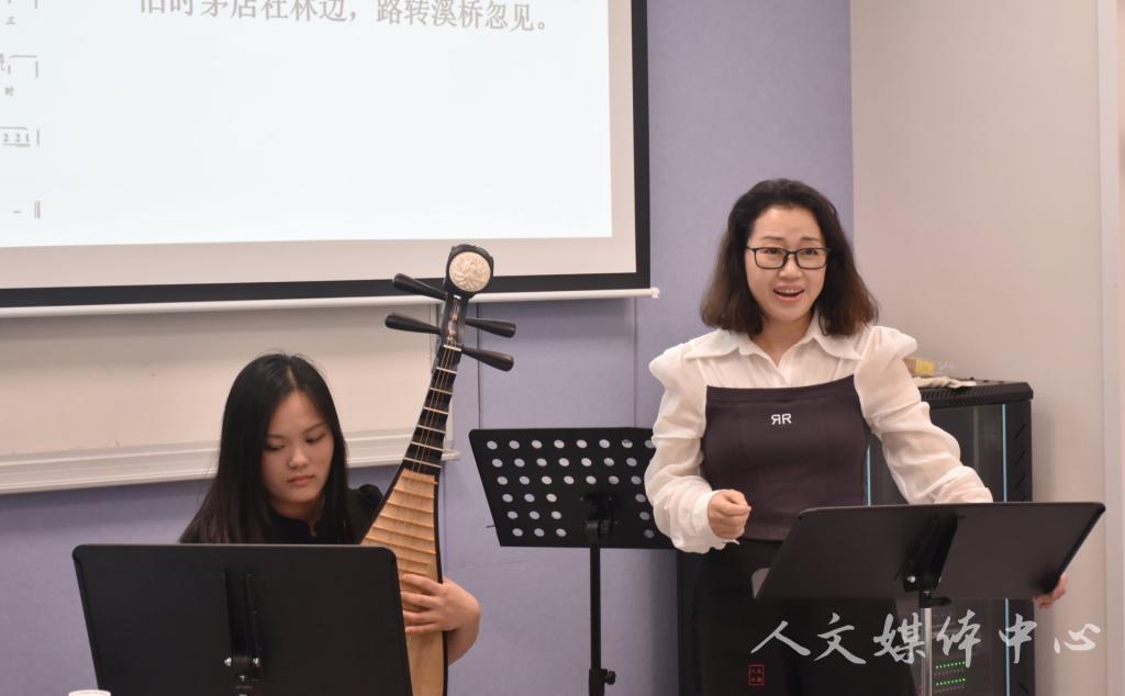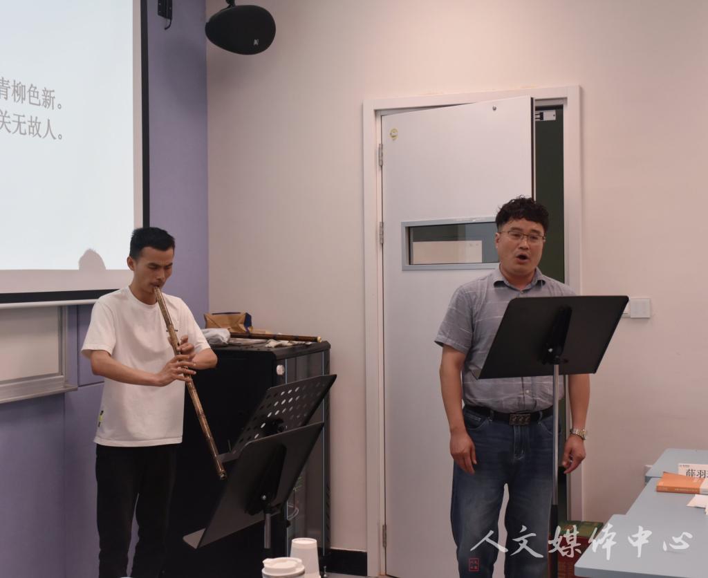 随后,为了让同学们深刻感受诗词的演唱方式和技巧,孔春恒和何金龙两位老师现场合作了《送元二使安西》。孔老师演唱技巧高超,歌声雄壮浑厚,使人身临其境。何老师使用笛子合奏,笛声悲昂,烘托了现场氛围。二位老师高超的演奏技术令现场观众仿佛真的置身那场离别之中。接着,叶高峰和林佳翌老师现场进行了多场合奏,叶老师的婉转歌声与林老师的优美琵琶声相得益彰,引得现场观众共情。同时,叶老师和林老师向大家介绍了音乐和诗词的相关知识,同学们获益匪浅。而马曙明老师吟诵的唐诗《江雪》《山行》以及宋词《雨霖铃》《菩萨蛮》等,更是将诗词的吟唱美表现得淋漓尽致。