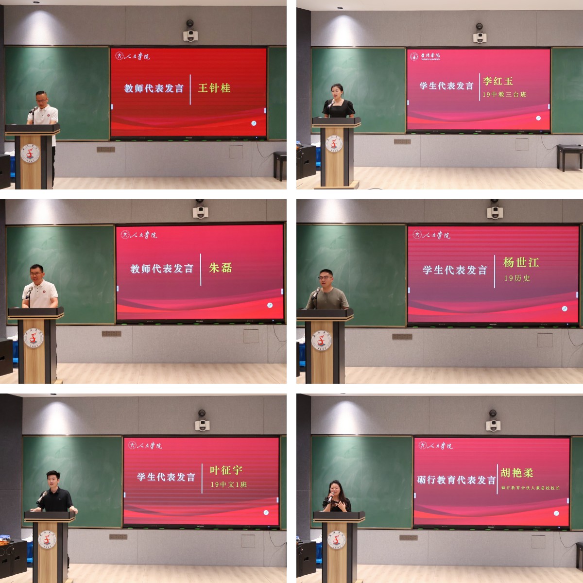 盛典上,“优秀指导教师”代表王针桂分享了师生携手,教学相长的感悟;“优秀员工”代表李红玉讲述了自己大学四年来的成长与蜕变;“优秀导师”代表朱磊建议同学们在备考过程中要增强自律意识;考研奖学金获得者代表杨世江分享了自己三次参加表彰大会的不同心情;“砺行”奖学金获得者代表叶征宇鼓励学弟学妹们奋力拼搏;砺行教育合伙人兼总校董事长胡艳柔建议同学们提早规划,为高质量就业打好基础。