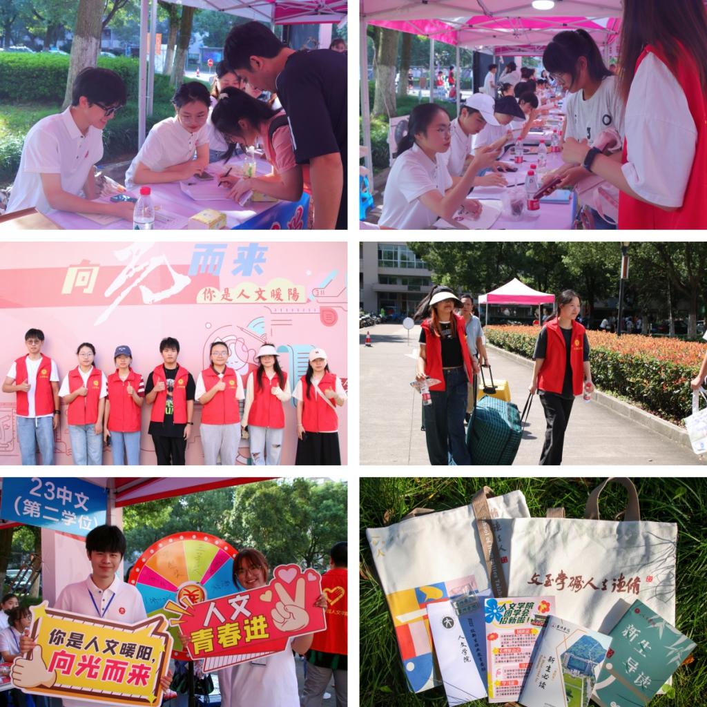 志愿者们整装待发,小推车、迎新手牌、宣传单和一个个红帐篷都已早早地在校园等待。报到处不仅有班助们准备的特色帆布包,还有惊喜的抽奖活动。此外,人文新生接待处还设置了“你是人文暖阳,向光而来”的合影留念墙,方便小萌新们留下步入大学的第一张笑脸。