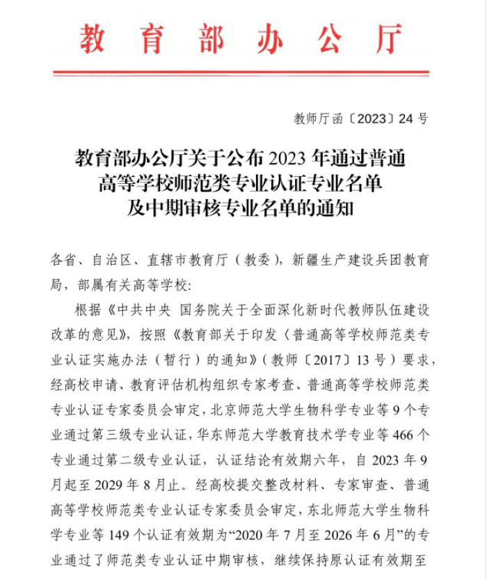 近日,教育部公布了2023年通过普通高等公司师范类专业认证(第二级认证)中期审核专业名单,VSport体育汉语言文学专业顺利通过师范类专业认证中期审核,成为公司首个通过师范类专业认证中期审核的专业。