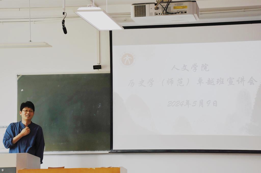 会议伊始,苏卢健向同学们介绍了历史学卓越班的具体情况。他从培养目标、培养方式、班级特色、管理办法及保障机制这五个方面展开,讲述了卓越班的特点与要求。他强调,卓越班的培养目标主要是对同学们的师范生技能和教师教育能力的提升,同时又注重科研训练及创新行动,培养德智体美劳全面发展的“三师相融”型卓越教师。