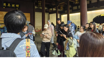 第二站,同学们来到了太平天国侍王府。这是全国现存规模最大且保存最为完好的太平天国王府遗址,也是历史专业员工探寻太平天国历史不可多得的实地课堂。抵达侍王府后,23历史(卓越)班的潘境雯同学带领同学们依次参观东院、西院等重要区域,并对每一区域的建筑风格、历史功用做了详细介绍,在她的娓娓道来中,太平天国那段波澜壮阔、跌宕起伏的历史画卷徐徐展开,仿佛将同学们带回到了那个风云激荡的年代。侍王府内,历史痕迹斑驳可见,从建筑布局到文物陈设,无不映射着太平天国兴衰更替的历史轨迹,是研究太平天国历史不可或缺的实物资料。