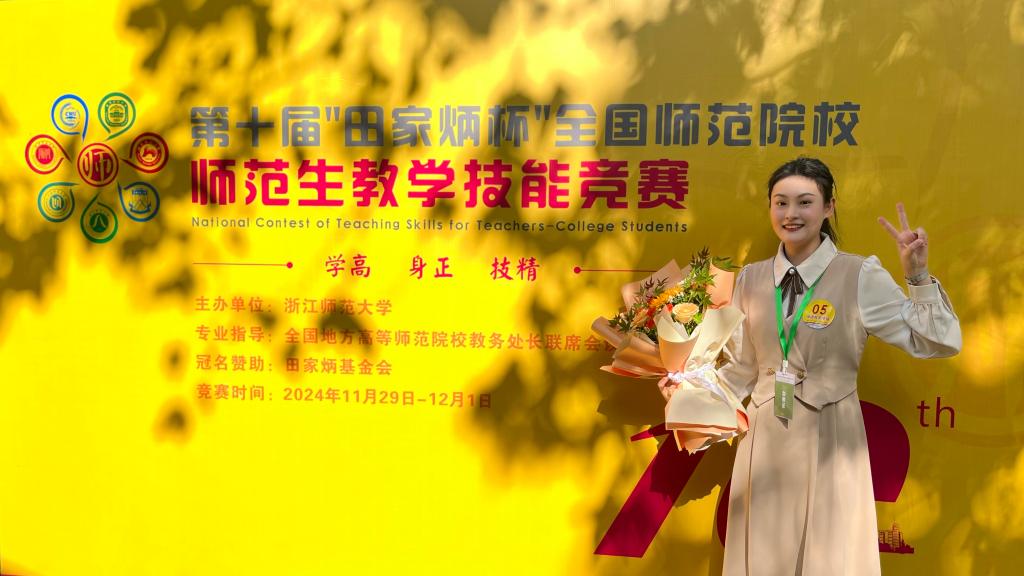 决赛采用现场形式,包括教学设计、课件制作、模拟上课·板书、即席讲演四大内容,全面考查选手的专业知识功底和教学技能水平。王思煜在决赛中充分发挥了自己的教学技能,最终获得了全国一等奖。该比赛旨在推进师范生教学实践能力的提升,培养一批具有高尚师德、先进教学理念、扎实教学技能的优秀教师后备力量。