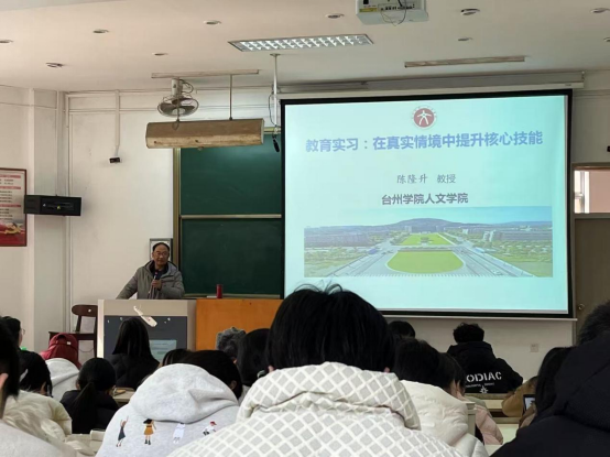 本次讲座围绕“教育实习”主题展开,内容分为三大模块:“何谓教育实习”“师范生专业核心技能构成”及“如何在实习中提升核心技能”。