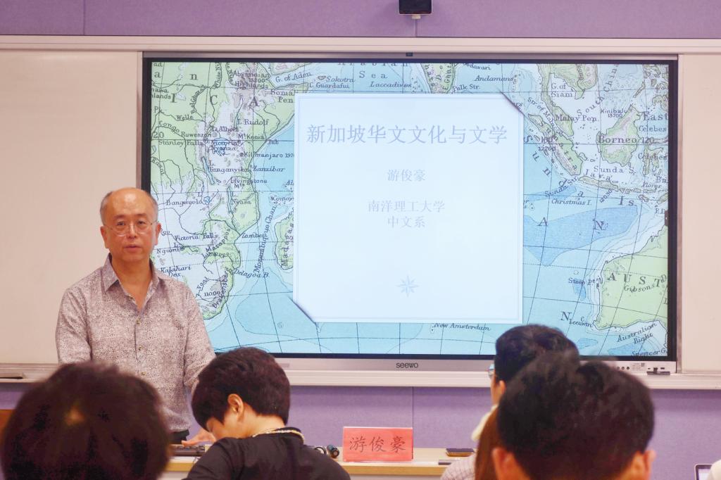 讲座伊始,游俊豪简要介绍了新加坡,指出新加坡作为华人聚集地之一,孕育了独具特色的华人文化。随后,他以几位具有代表性的作家为例,梳理了百年间新加坡华文文化的发展脉络,剖析其背后折射的历史背景:胡愈之在新加坡期间的创作,流露出对新加坡的眷恋之情,以及渴望回归中国的“落叶归根”情怀;苗秀、英培安的作品呈现出华文文化在新加坡发展所面临的困境;梁文福的创作体现了对多元文化元素的成功整合;谢裕民以现代化视角进行“落地生根”式写作;张悦然的作品细腻刻画出女性情感世界。此外,游俊豪引导师生从历史和地理的维度来审视文学,理解新加坡作家对地理文化与身份政治流动性的认知。