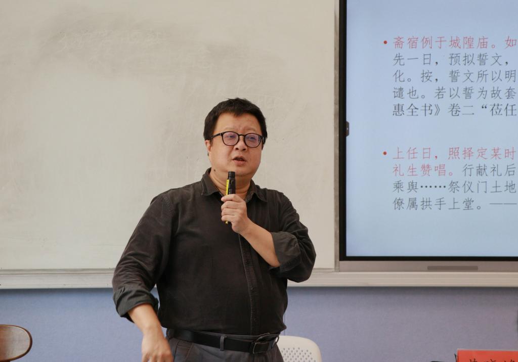 讲座伊始,黄晓峰编辑借用古代文献,简明地阐述了“幽”“明”之间的关系,并介绍了幽冥世界基层治理的概念。通过《搜神记》《夷坚志》《阅微草堂笔记》等文献,他详细介绍了从汉魏至明清冥府与冥官的演化历程,展示了从古至今冥府是怎么在古人眼中由天庭、星宿转变为地府,且由顶层到基层逐渐世俗化、平民化并最终融入基层治理和实现教化作用的。随后他结合《祭乡厉文》重点讲述了城隍信仰发展史上的里程碑——洪武城隍祭祀新制的历史意义,分析了明太祖封城隍神是如何从国家祀典角度出发,实现了祭祀形式的制度化、规范化和理论化。