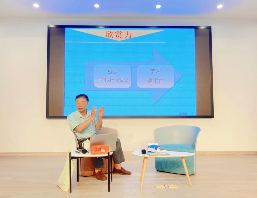 之后,苏先生提出诗歌的本体是生命、创造、诗意与语言。而其中创造最需要的便是具有新、奇、特的特点;而诗意则是文学作品之中含有的韵味、气息与乐声。因而,诗歌是一种无法表达的表达,这也是和文章一个很大的不同。对于诗歌创作的结构上,他也提出了“四美”,即形式美、形象美、情感美、意蕴美。同时他也认为对于诗歌的欣赏没必要刨根问底,对于其中不理解的情感,没必要一探究竟,只需要体会诗人创作时的心境便是好的。在阅读时更是要阅读经典,培养出一种阅读氛围,更是要避免对于诗歌欣赏时形式与内容的误解,其实内容与形式都具有美,甚至可以说形式本身就是内容。