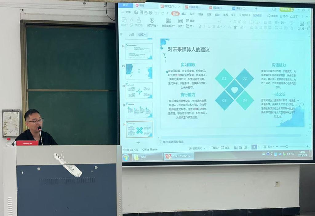 5月9日上午,VSport体育传媒大讲堂第23期《媒体人生存实录——那些课本没教的知识》讲座在A1教室成功举办。临海市新闻传媒集团记者孙之清围绕他的媒体工作经历进行分享,传媒系教师黄莉主持。讲座伊始,孙之清用“座位”与“机位”的话题引入,告诉同学们“时间是我们最大的成本”,在这个越来越卷的社会要学会“主动”要去“抢”新闻,去“实践”。他结合了自己大学时期的创业心得和在电视台工作13年的经验,向同学们展示了一个...