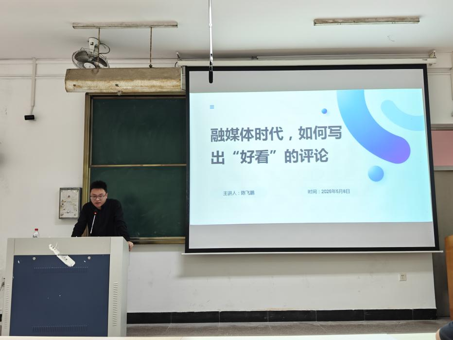 5月8号上午,《融媒体时代,如何写出“好看”的评论》讲座在A1教室举行。台州市新闻传媒中心评论员陈飞鹏任主讲,陈日红老师主持本次活动,23级网络与新媒体、汉语言文学专业、24级汉语言文学(专升本)共计200余位同学参加讲座。评论写作的理念必须清晰。讲座伊始,陈飞鹏从新闻评论与新闻、论文的区别切入,指出新闻评论其实是一种议论文,多写评论对写申论是有帮助的。接着,他以墨子“言必有三表”的评论理念为引,对“有...