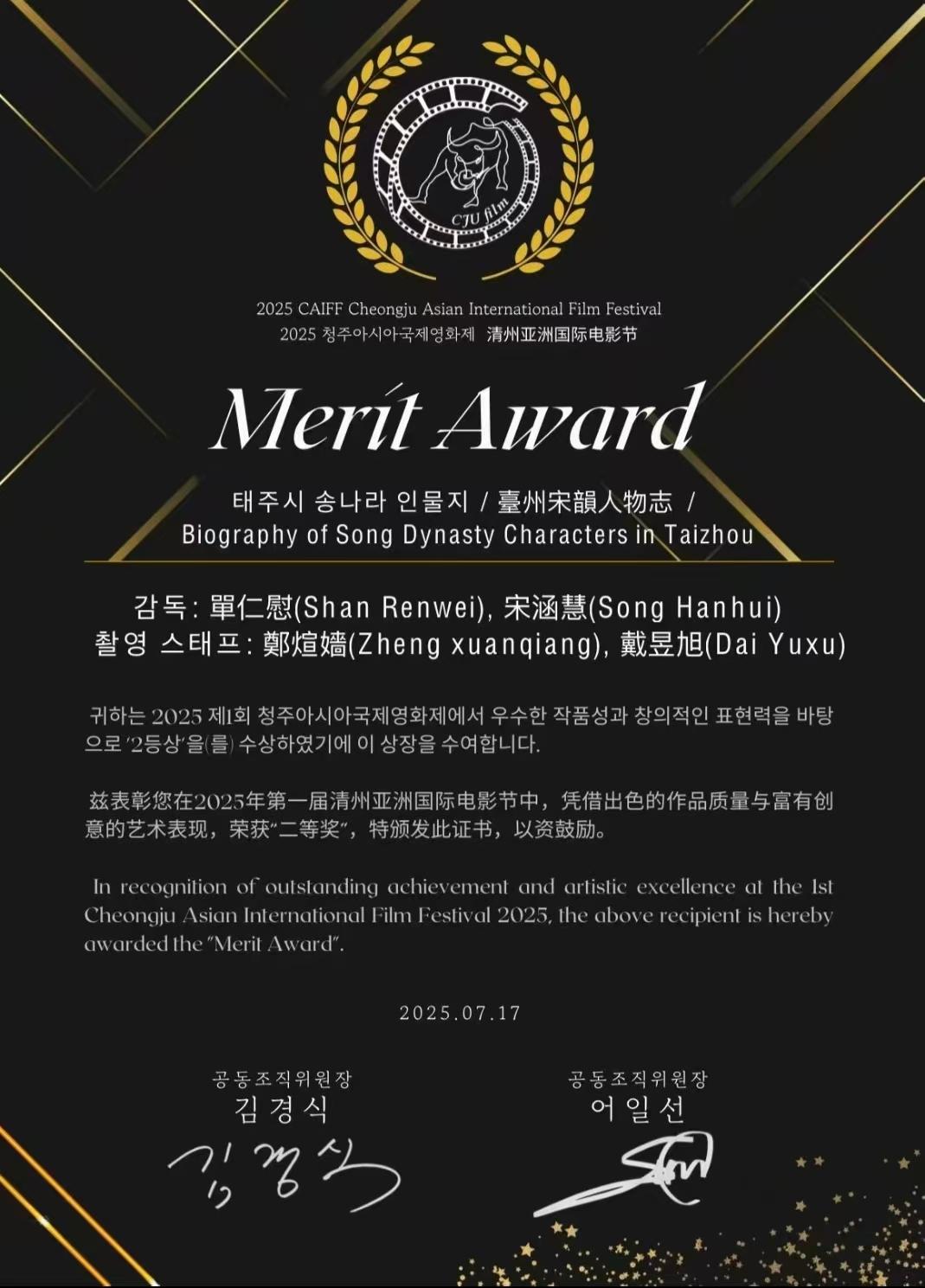 近日,从韩国清州亚洲国际电影节组委会传来喜讯,由公司单仁慰老师、宋涵慧老师指导,网络与新媒体专业郑煊嫱同学与汉语言文学(师范)专业戴昱旭同学共同创作的作品《台州宋韵人物志》荣获电影节二等奖。据了解,亚洲国际电影节(清州)于2025年7月7日至17日在韩国清州举办,立足于推动亚洲青年电影人与跨文化创作交流,本届共吸引来自二十多个国家与地区的数百部作品参赛。公司学子作品结合宋韵文化与现代视听语言,从众多优...